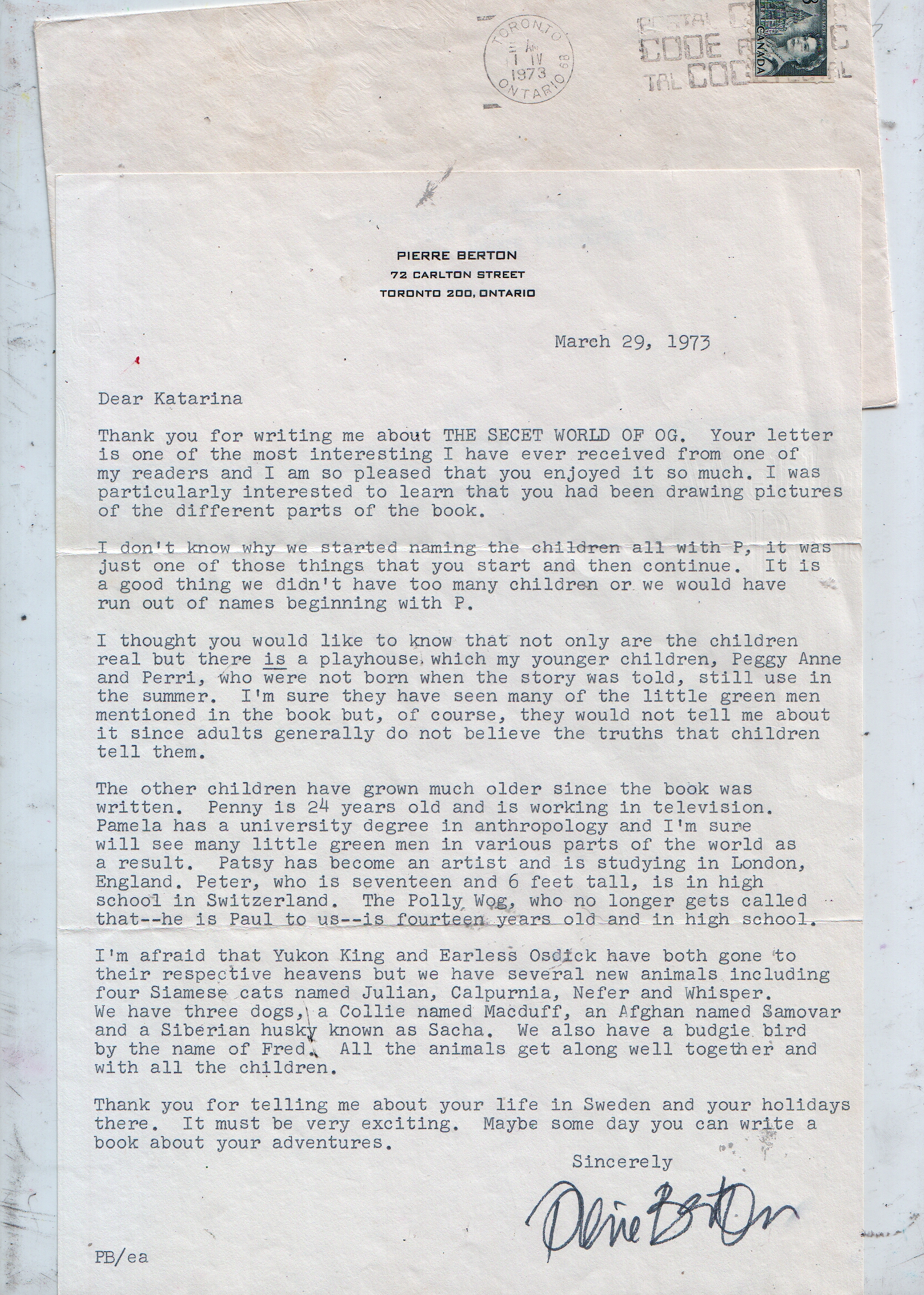 Of his forty-seven books, this was Berton’s personal favourite, partly because the characters were inspired by his own children. The Secret World of Og brought the author more fan mail than anything else he wrote – at least a dozen letters a week from children across Canada. [source]
